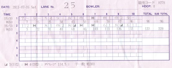 なんかちーっともレーンに慣れず、1ゲーム目は目を覆わんばかりのひどい結果に。2ゲーム目はなんとか態勢を整えて133。