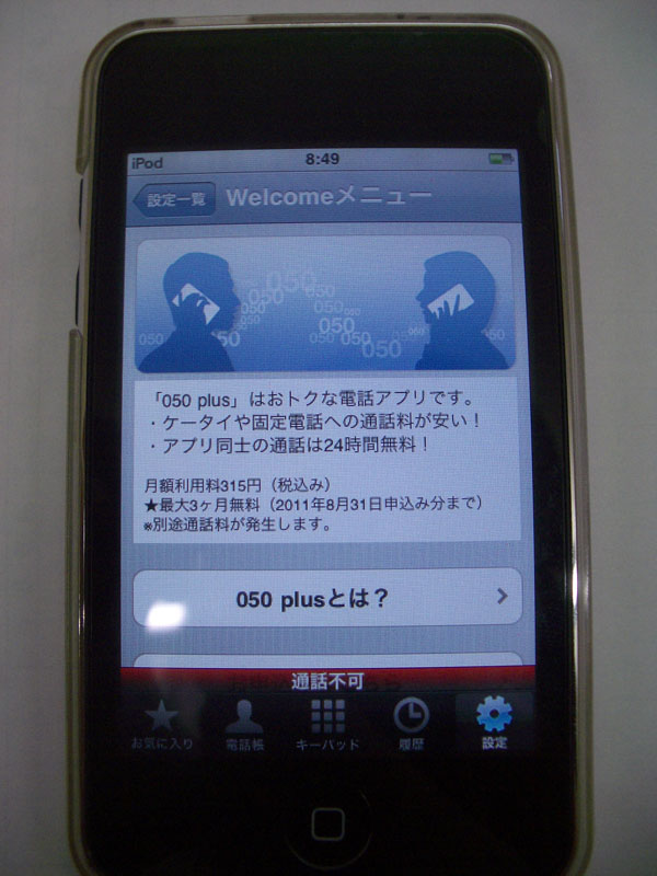 こちら、月額315円で050のIP電話番号がもらえて通話できるというもの。iPhoneのみ対応のアプリと書いてあるけれど、実はiPadやiPod touchでも使えるらしい。