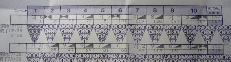 ■こんな感じ。167の152でアベレージ159.5。うむ。悪くない。今までのアベレージがだいだい120~130で推移していたけど、最近調子があがってきたようだ。イイカンジ。土曜の大会までこのアベレージを維持したいねー。