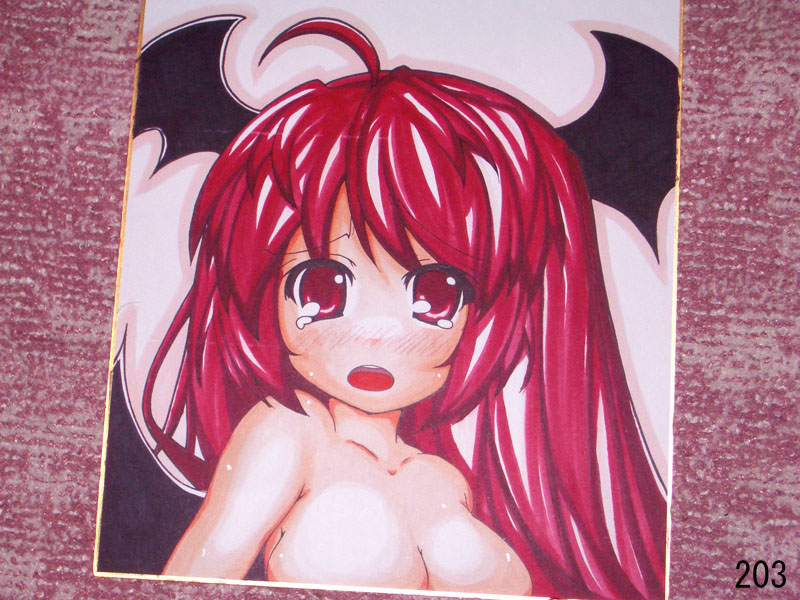 100日イラストマラソンの完走に失敗した知り合いの罰ゲーム「ユイが描いた半裸のこぁ色紙をスペースに飾る」を当日、実行しました。この色紙のおかげ(せい?)でスケブの依頼はみごとこぁになりました。ルーミア島でルーミアが嫁な彼ですが、せっせとこぁを描いていました。