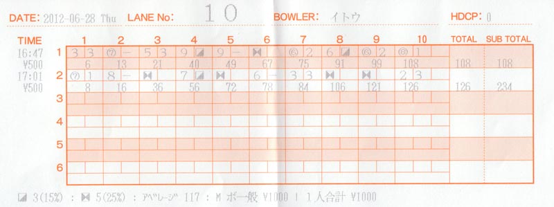土曜日が大会ということで、一応時間作って投げてきました。一人で投げてこのスコアはかなり恥ずかしい。周りに誰もいなくてよかったよ。