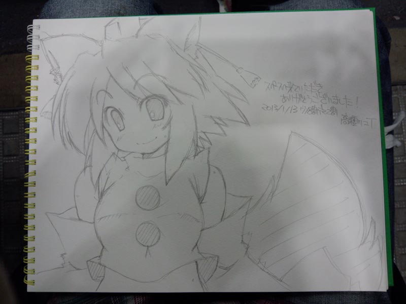 イラスト合宿で彩色したこまっちゃん色紙はお嫁に行きました。新年ということで、紅白の背景を書いておめでたい雰囲気を出しました。元気でね・・・。