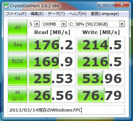 なんとWin8インスト時よりもよい成績が!しかも書き込みのほうが速くなってるし!!OSが原因だとすれば、Win7でよかったということになりますな。