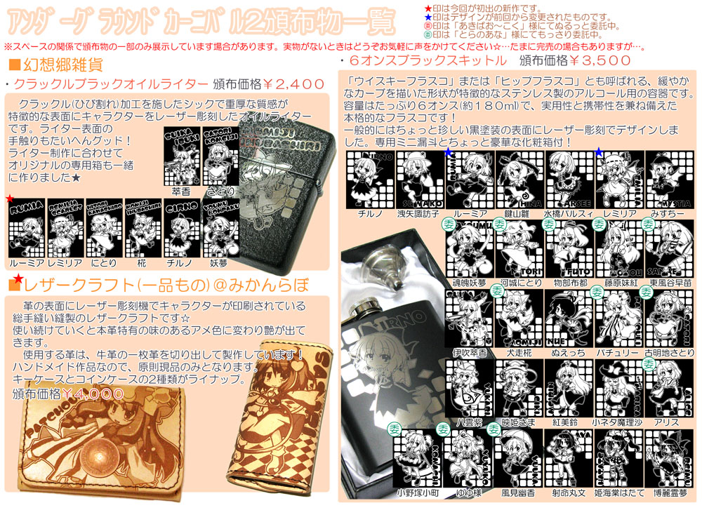 手に持ったときの感触とライターが持つ質感が好評のオイルライターです。専用小箱(初期作)に入れての頒布となります。ルーミアが新規登場です(想七日で先行委託したため少数です)。