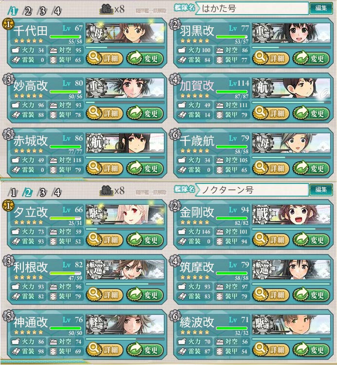 上固定ルート編成後、さらに艦戦ガン積み編成を加える。ありったけの烈風と紫電改二を空母に詰め込んだおかげで1周あたり500くらい吹っ飛んでいたボーキが200~250程度に納まりました。ホントはもっと周回したかったけど体調不良でほとんどできず。無念。