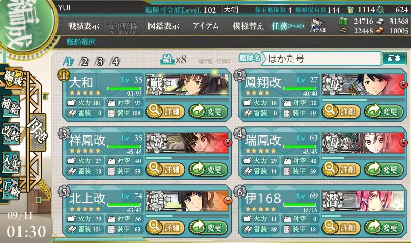 先週八雲先生に教えてもらった3-2-1レベリングを実施中。レベリング艦を旗艦において、軽母x3、雷巡x1、潜水艦x1で艦隊を組んでひたすら回るというもの。開幕航空戦でできるだけ殲滅させるため軽母には艦爆をできるだけ積むのがポイントぽい。航空戦には疲労度は関係ないみたいなので、赤疲労でも落としてくれる。そんなこんなでウチもすっかりブラック鎮守府になっちゃった。