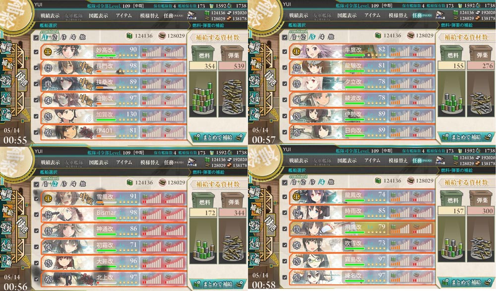 最初は支援艦隊なしだったけど、だんだん負けが込んできたので道中支援を出して、最後10回あたりから決戦支援を加えた全4艦隊の総力戦でした。ボスは仕方ないとしても、手前の空母おばさんが前回イベのE-4周回時と同じく邪魔してくれました。かなり。