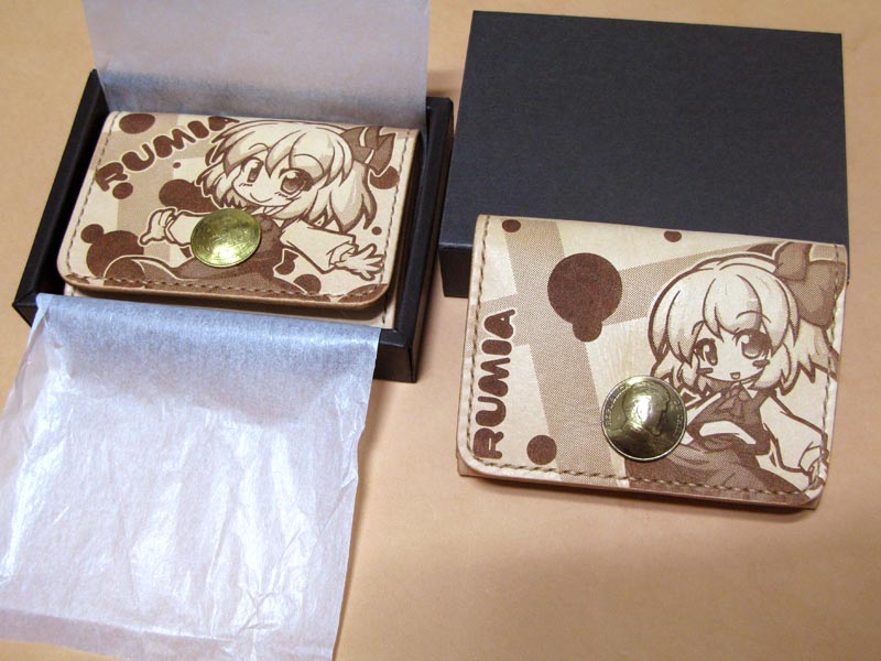 これもメイン頒布物、手縫いのレザークラフトです。こちらはコインケースになります。デザインは2種類。こちらも想七日用に化粧箱を作ってみました。現在、キーケースも鋭意製作中です。もしかしたら間に合うかも?