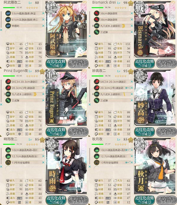 たまに編成を変えてみた。重巡を旗艦にするとやたらに逸れた。ボスとダイソンが気持ちいいくらいこちらのスナイプ艦を狙ってくれました。本当にありがとうございました。