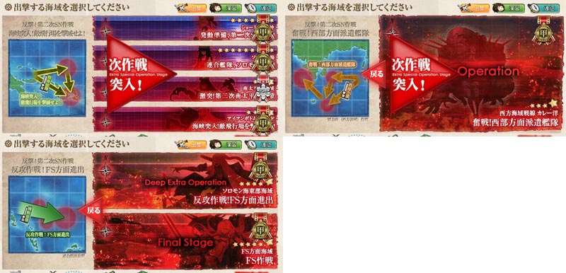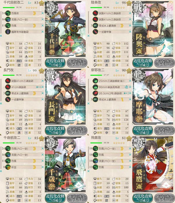 最終クリア時の編成。基本は周回主義さんのを参考に。軽母や駆逐にダメコン積んだりしてたけど、結局最後まで発動することはありませんでした。