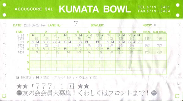来月のボウリング大会に向けて練習会です。3ゲームした結果がこちら。長い間アベレージ120でしたが、今は130あたりまで底上げされました。