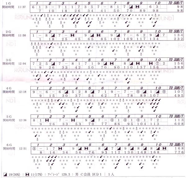 先週の雪辱を果たすべく再挑戦。最初のうちは先週の二の舞になると思いきや、スペア・ストライクの数がだんだん増えてきました。3ゲーム目を境にスコアが下がってきましたが、ラスト6ゲーム目でここ最近のベストスコアが出ました。