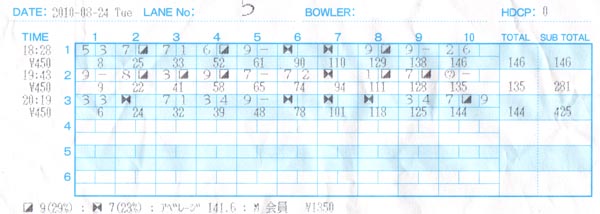 28日の本大会までの実質最終練習会でこのスコア。目標のアベレージ150は到達していないけれど、悪くない数字です。いつもより手からボールを離すタイミングを少し遅めにしてみたら、今まで違ってカーブがかかるようになりました。どうやら手を離すタイミングが早すぎたようです。道理で、今までよく投げる前にボウルが床にかすってあらぬ方向へ飛んでいたワケだw